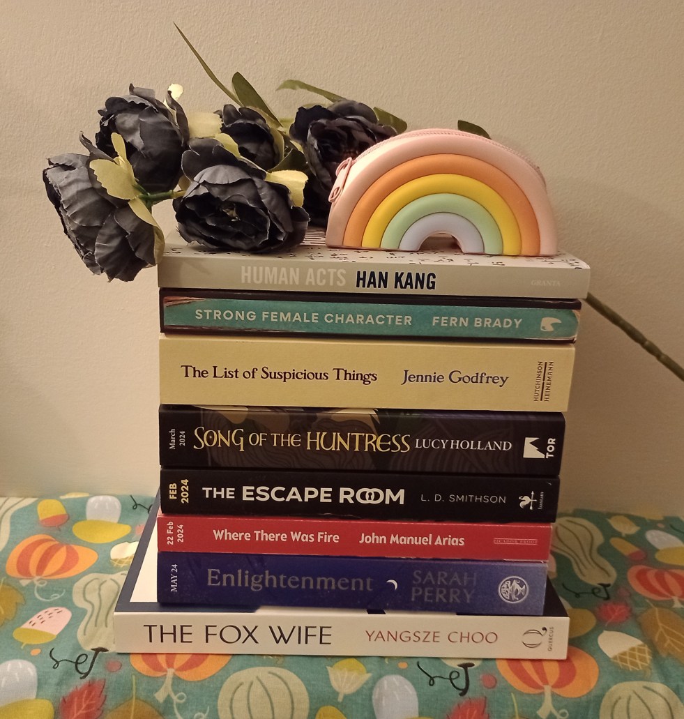 ❤️ Human Acts by Han Kang 🧡Strong Female Characters by Fern Brady 💛The List Of Suspicious Things by Jennie Godfrey 💚Song Of The Huntress by Lucy Holland * 💙The Escape Room by L.D Smithson* 🩵 Where There Was Fire by John Manuel Arias * 💜 Enlightenment by Sarah Perry * 🩷The Fox Wife by Yangsze *